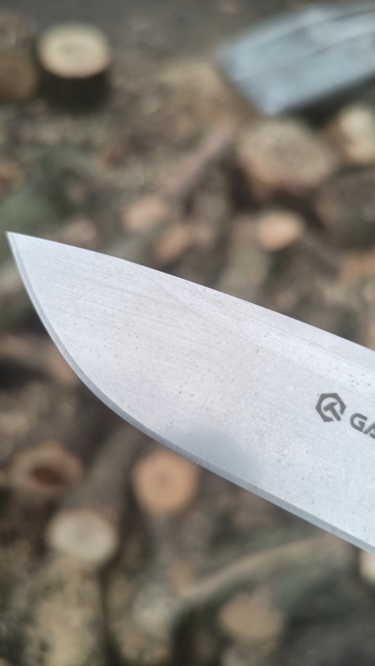 Заточка лезвия гладкая. Сталь ножа будет долго удерживать заточку, поэтому особых хлопот при уходе за ним у пользователя не возникнет. Материал не подвержен коррозии. Есть насечки на обухе для более удобного захвата и удержания ножа.