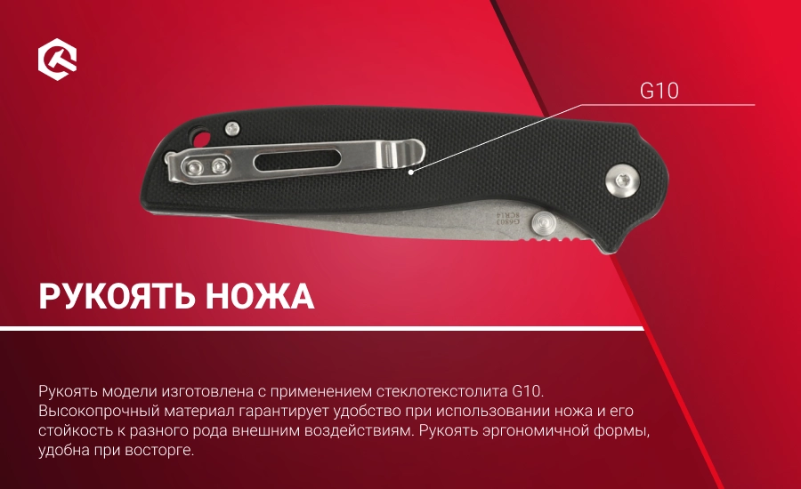 Рукоять модели изготовлена с применением стеклотекстолита G10. Высокопрочный материал гарантирует удобство при использовании ножа и его устойчивость к разного рода внешним воздействиям. Рукоять эргономичной формы, комфортная при захвате. Поверхность рукоятки текстурированная, благодаря чему нож надёжно удерживается в руке при любых условиях. Металлическая клипса позволяет фиксировать изделие, и носить его на кармане, на поясе либо прикреплять к сумке. Предусмотрено отверстие для темляка.