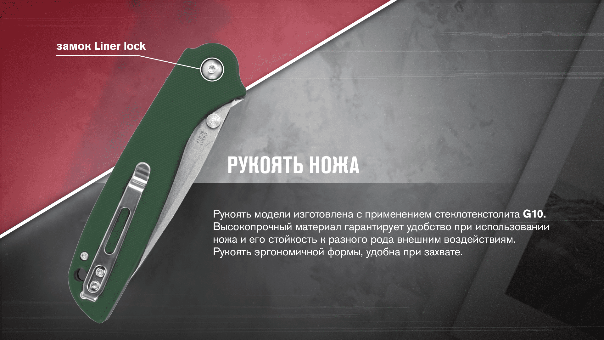 Рукоять модели изготовлена с применением стеклотекстолита G10. Высокопрочный материал гарантирует удобство при использовании ножа и его устойчивость к разного рода внешним воздействиям. Рукоять эргономичной формы, комфортная при захвате. Поверхность рукоятки текстурированная, благодаря чему нож надёжно удерживается в руке при любых условиях. Металлическая клипса позволяет фиксировать изделие, и носить его на кармане, на поясе либо прикреплять к сумке. Предусмотрено отверстие для темляка.