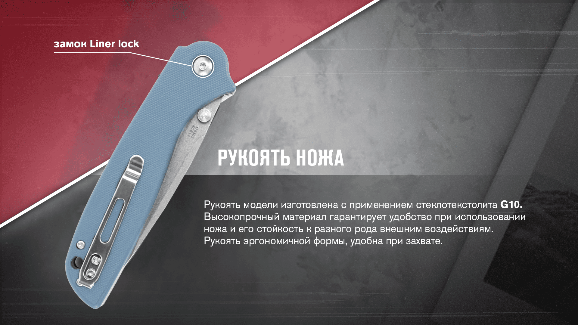 Рукоять модели изготовлена с применением стеклотекстолита G10. Высокопрочный материал гарантирует удобство при использовании ножа и его устойчивость к разного рода внешним воздействиям. Рукоять эргономичной формы, комфортная при захвате. Поверхность рукоятки текстурированная, благодаря чему нож надёжно удерживается в руке при любых условиях. Металлическая клипса позволяет фиксировать изделие, и носить его на кармане, на поясе либо прикреплять к сумке. Предусмотрено отверстие для темляка.