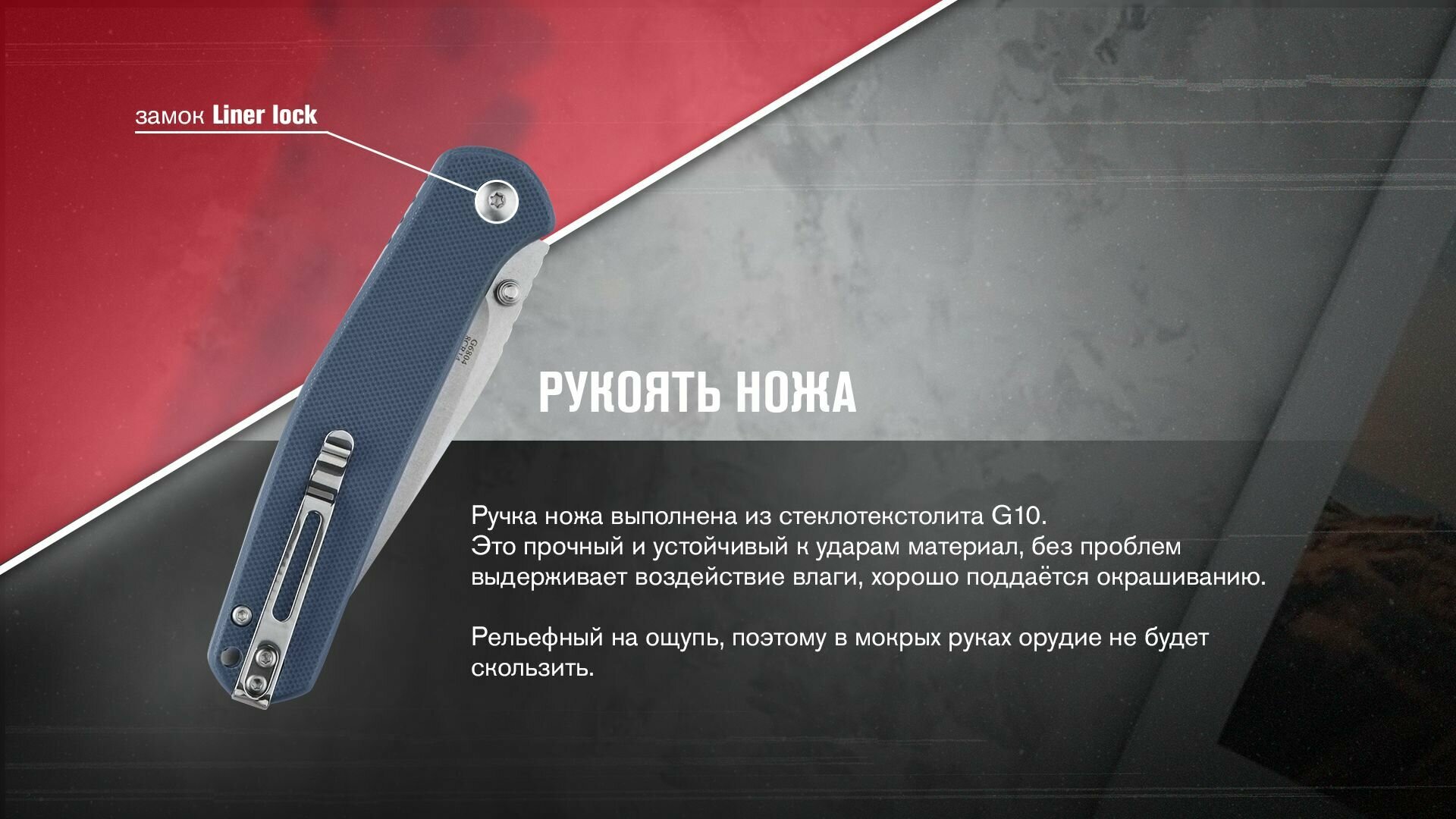 Ручка ножа выполнена из стеклотекстолита G10. Это прочный и устойчивый к ударам материал, без проблем выдерживает воздействие влаги, хорошо поддаётся окрашиванию. Рельефный на ощупь, поэтому в мокрых руках орудие не будет скользить.