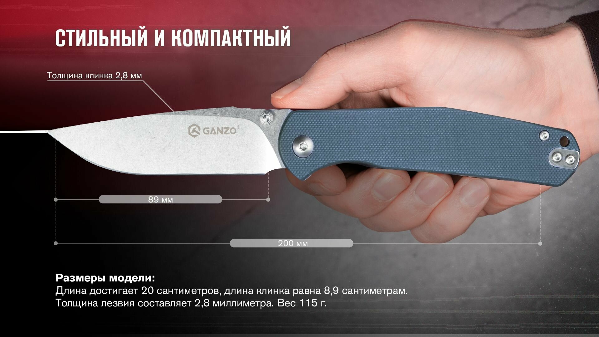 Размеры модели: длина достигает 20 сантиметров, длина клинка равна 8,9 сантиметрам. Толщина лезвия составляет 2,8 миллиметра. Цвета рукояти: серый, зелёный, чёрный.