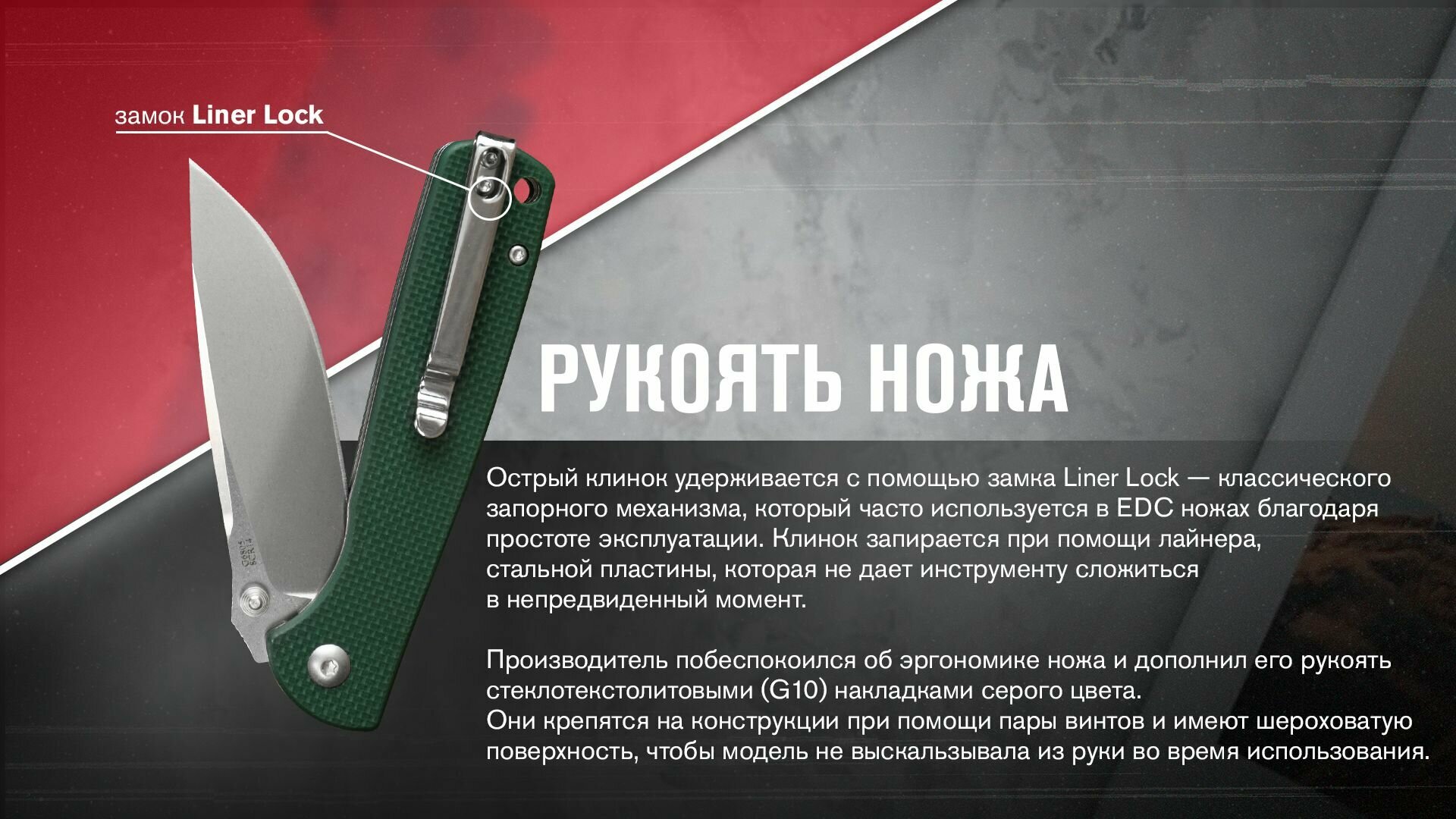 Производитель побеспокоился об эргономике ножа и дополнил его рукоять стеклотекстолитовыми (G10) накладками зеленого цвета. Они крепятся на конструкции при помощи пары винтов и имеют шероховатую поверхность, чтобы модель не выскальзывала из руки во время использования. Длина рукояти составляет 112 миллиметров и подходит обладателям ладони любого размера.