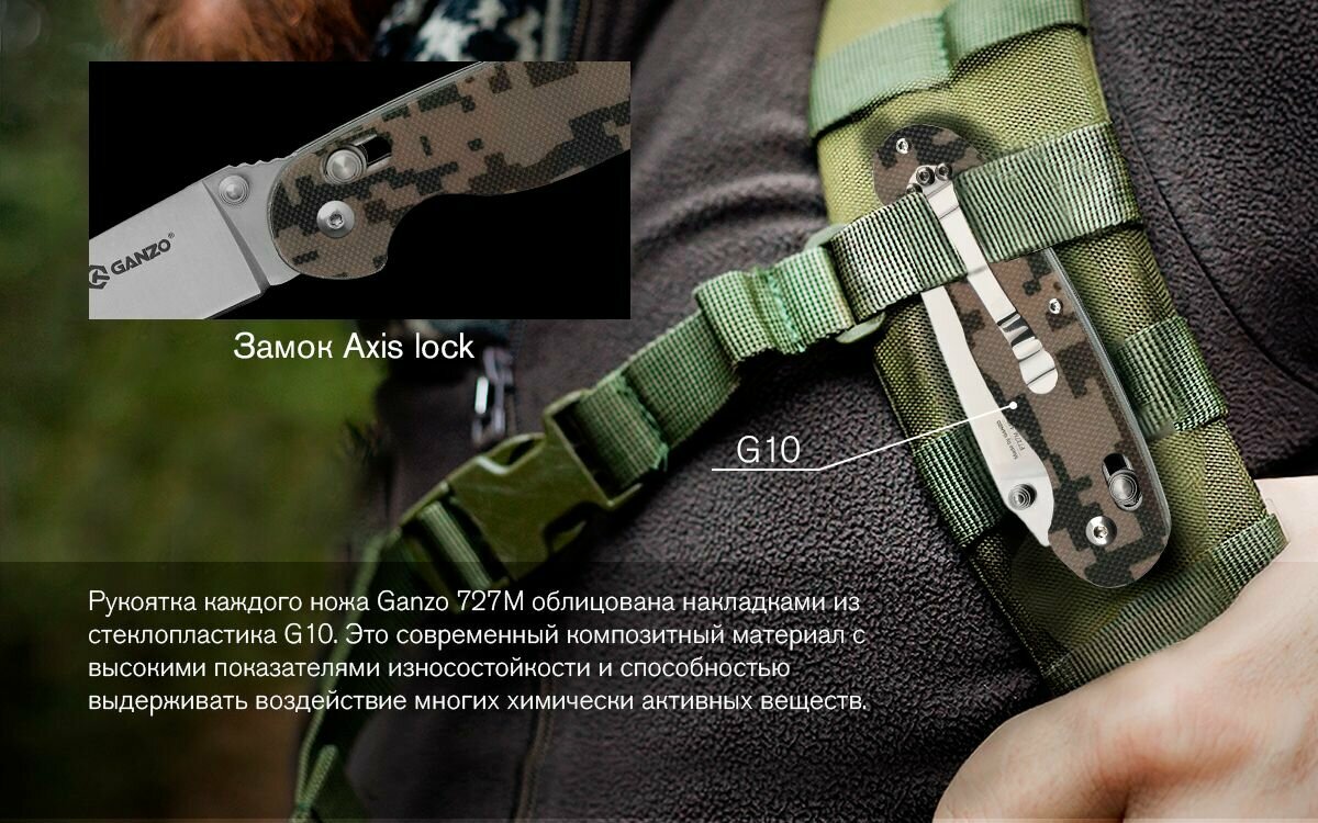 Модель Ganzo 727M создана таким образом, чтобы максимально полно удовлетворить потребности туристов и других любителей загородного отдыха, а также людей, которым карманный нож необходим ежедневно. Этот складной нож эффективно работает с самыми разными материалами: пищевыми продуктами, тканями, ветками и т.д. Поэтому он станет отличным вспомогательным инструментом для рыбаков, обитателей кемпинга, мастеров по ремонту.