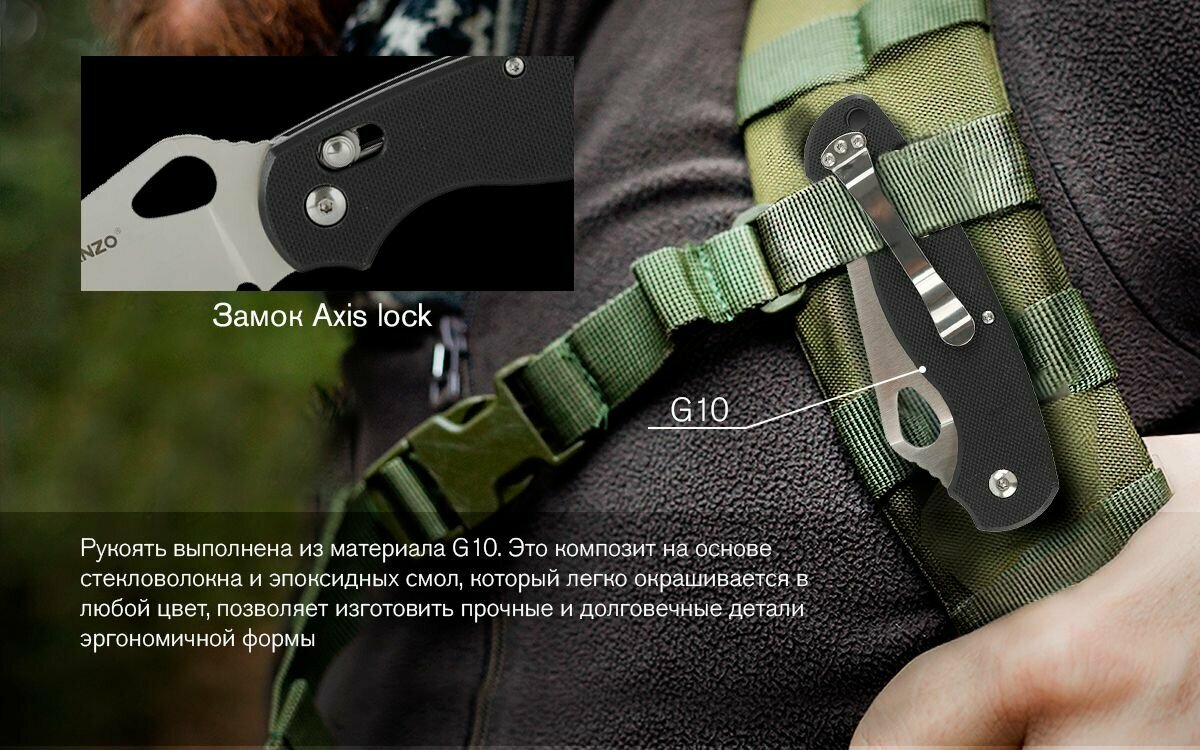 Фиксируется клинок при помощи ножевого замка Axis Lock. Это очень прочный штифтовый фиксатор, который выдерживает огромные нагрузки. Но чтобы надолго сохранить работоспособность этого замка, за ним требуется хороший уход, поскольку забившаяся грязь может помешать движению штифта.