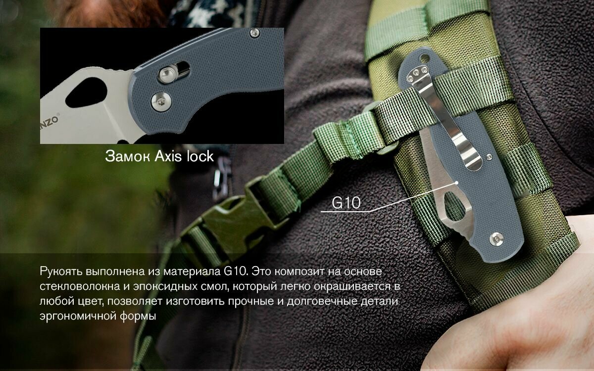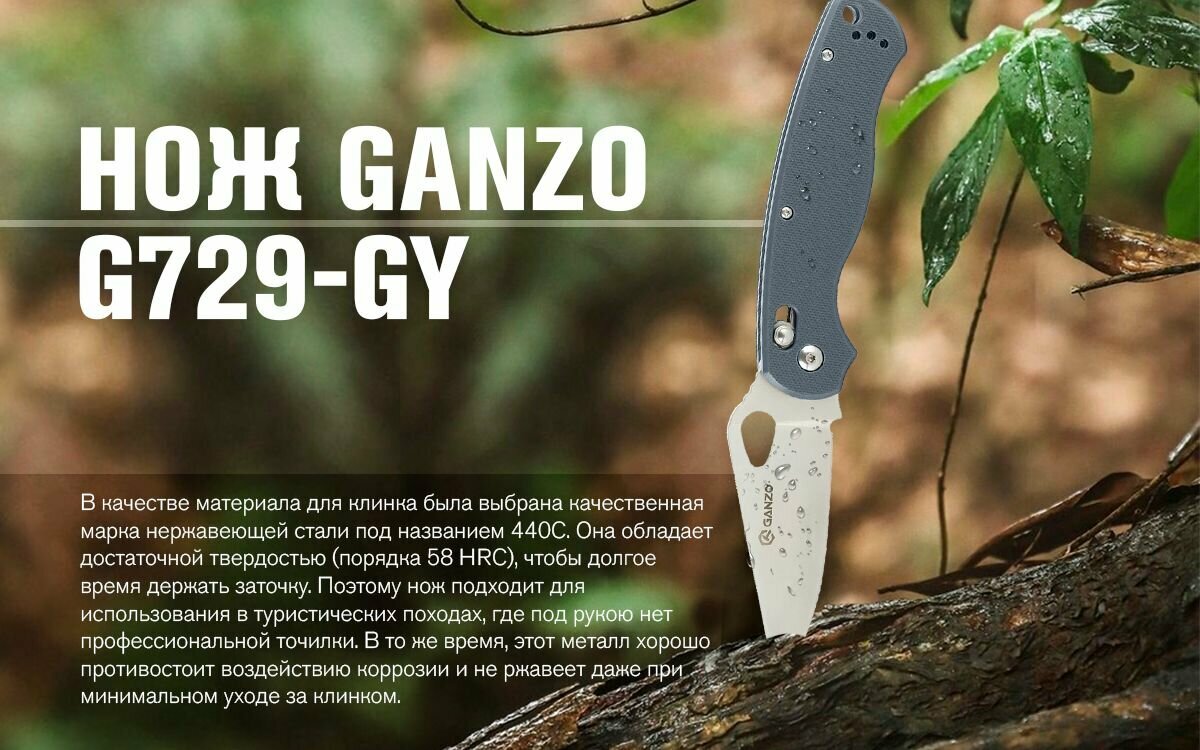 Стильный и функциональный нож Ganzo G729-GY имеет схожий дизайн с моделью Spyderco и является олицетворением надежного клинка для повседневного использования, который не боится сложной работы. В основе модели проверенные материалы, включая хромистую сталь 440C и высокопрочные накладки G10, которые делают нож универсальным инструментом.