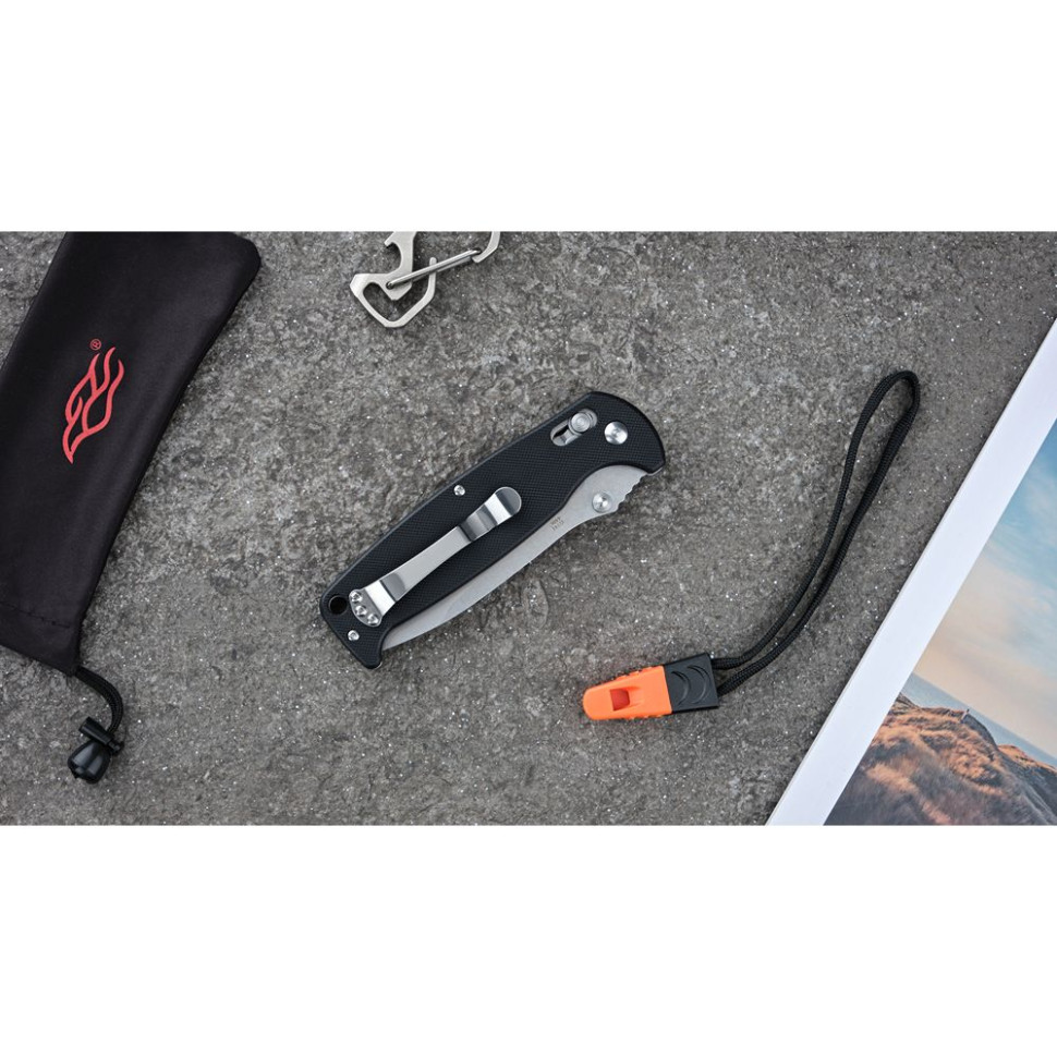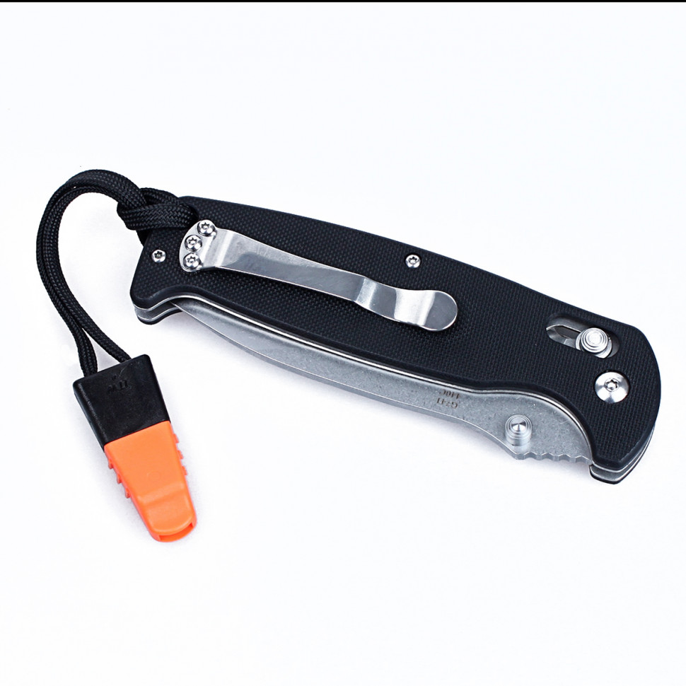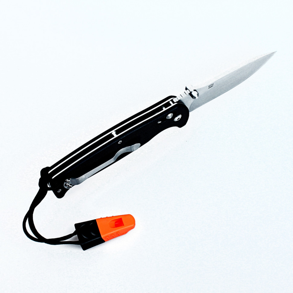 Его поверхность обработана по методу Stone Wash, из-за чего на ней видны следы от шлифовочных материалов. Этот тип обработки делает ножи почти не бликующими, а также на них гораздо меньше заметны небольшие царапины. Режущая кромка же заточена полностью гладко, чтобы нож ровно и легко резал практически любые материалы. Полная длина клинка от острия до обуха - 89 мм. Лезвие довольно прочное и по обуху его толщина равна 3,3 мм. Остальная часть из длины ножика 205 мм приходится на рукоятку. Она сделана из пластика G10, который сейчас является одним из наиболее популярных для этой детали материалов. Поверхность рукоятки ровная, но для того, чтобы она не скользила в руках, на пластик нанесен мелкий фактурный узор. Покупатели могут выбрать нож G7412 одного из трех цветов: черный, темно-зеленый или ярко-оранжевый. К каждой рукоятке уже присоединен темляк, на другом конце которого имеется небольшой свисток. Этот аксессуар вполне способен вам помочь, если во время отдыха на природе потребуется подать звуковой сигнал отдельным участникам группы.
