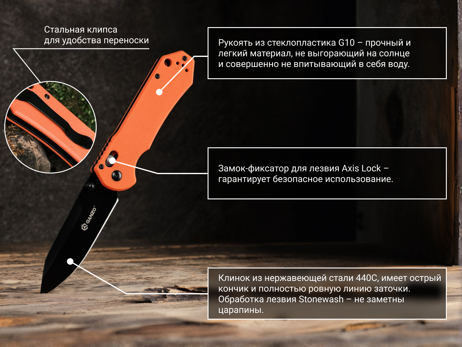 Складные ножи особенно удобны для туризма, а модель Ganzo G7453-OR сделана таким образом, чтобы учесть все особенности полевого использования. Металл для этого ножа — нержавеющий. Это твердая марка стали 440С (порядка 58HRC), которая способно долгое время сохранять высокое качество заточки. Клинок имеет острый кончик, характерный для формы drop-point, и полностью ровную линию заточки. Чтобы поверхность лезвия не блестела на солнце, она покрыта стойкой синтетической краской черного цвета. Как результат — металл матовый, а нож не только практичный, но и очень привлекательный внешне. Царапины на такой поверхности практически не заметны, поскольку для покрытия используются только материалы высокого качества.