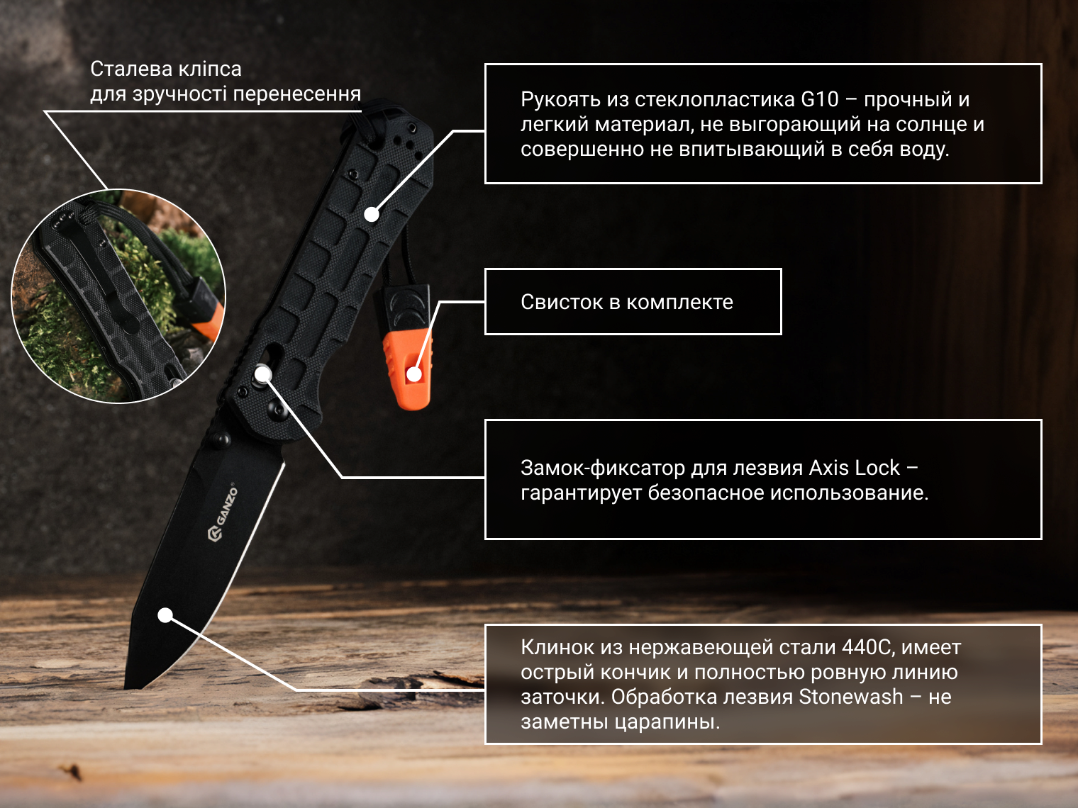Складные ножи особенно удобны для туризма, а модель Ganzo G7453P сделана таким образом, чтобы учесть все особенности полевого использования. Металл для этого ножа — нержавеющий. Это твердая марка стали 440С (порядка 58HRC), которая способно долгое время сохранять высокое качество заточки. Клинок имеет острый кончик, характерный для формы drop-point, и полностью ровную линию заточки. Помимо режущей кромки, остальная часть лезвия имеет стойкое черное покрытие, которое, к тому же, делает металл матовым. Такой нож выглядит очень стильно и может использоваться не только в туристических, но и в тактических целях. Покрытие клинка не стирается со временем, хотя во время проведения заточки, боковую часть лезвия стоит заклеить монтажной лентой, чтобы уберечь от воздействия абразивов.