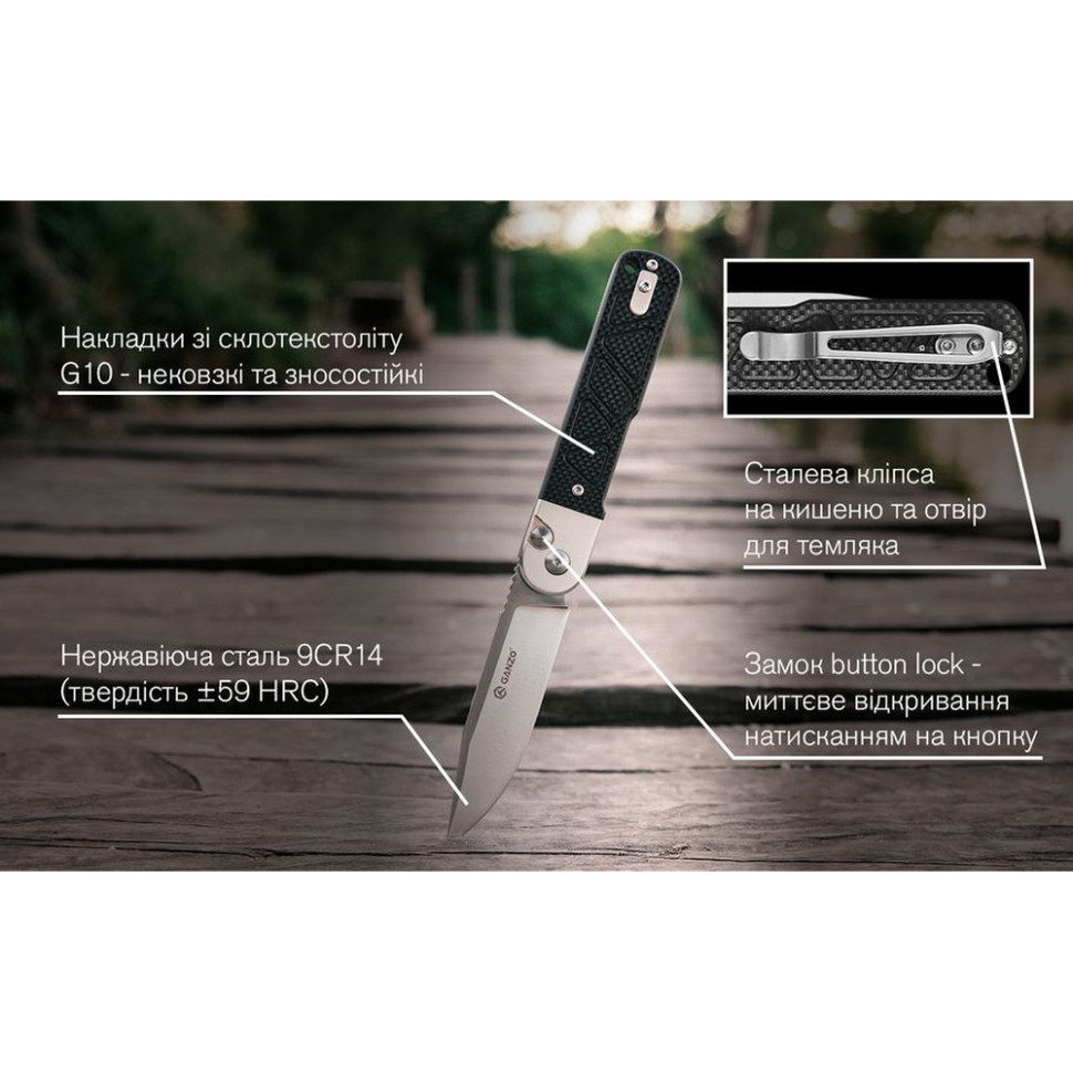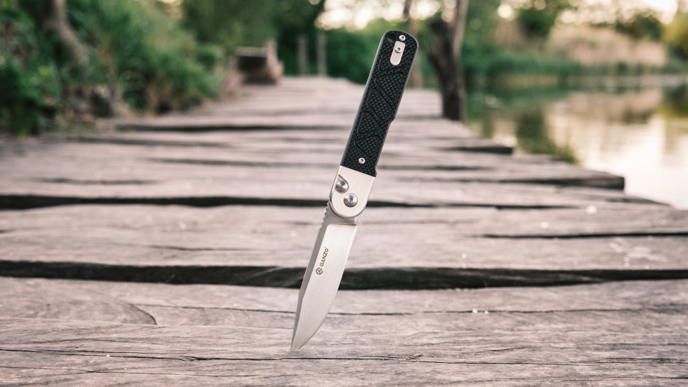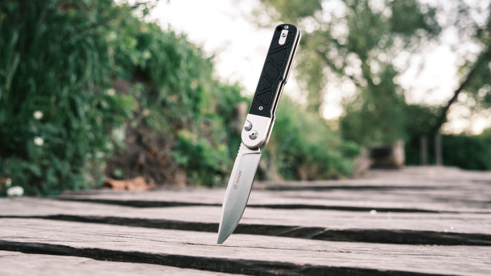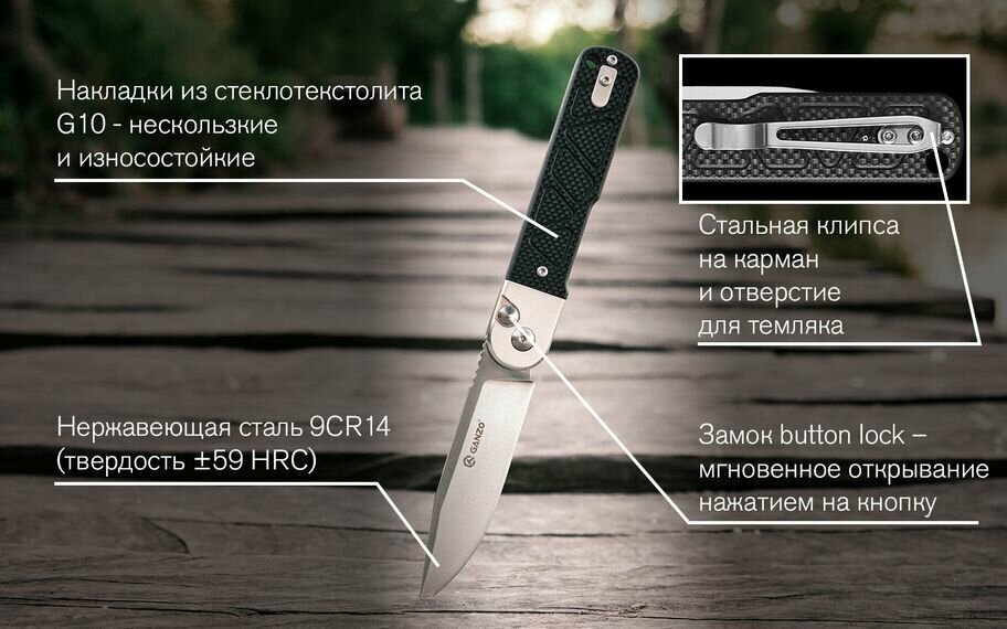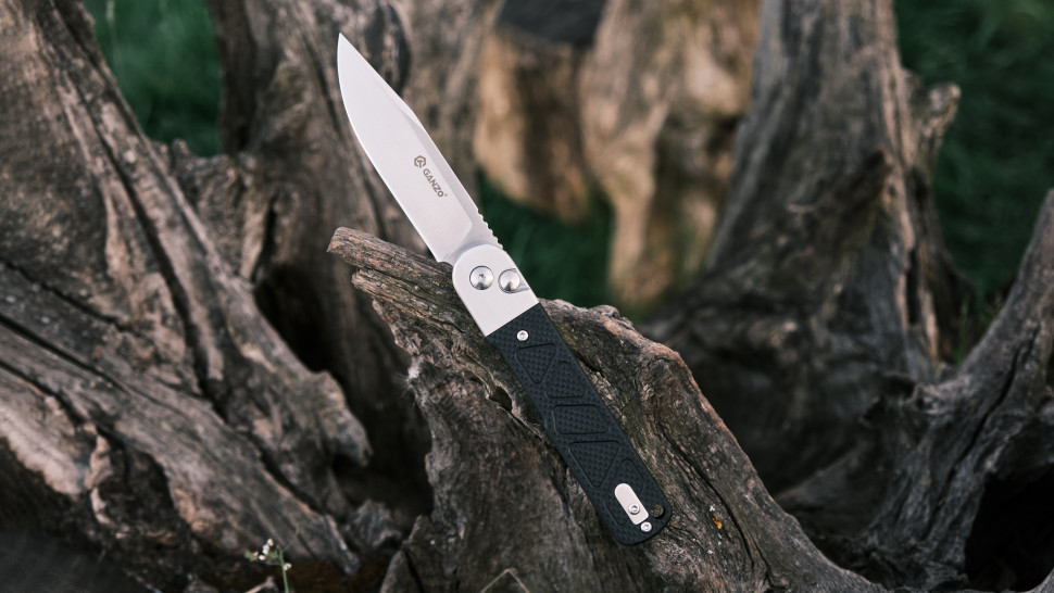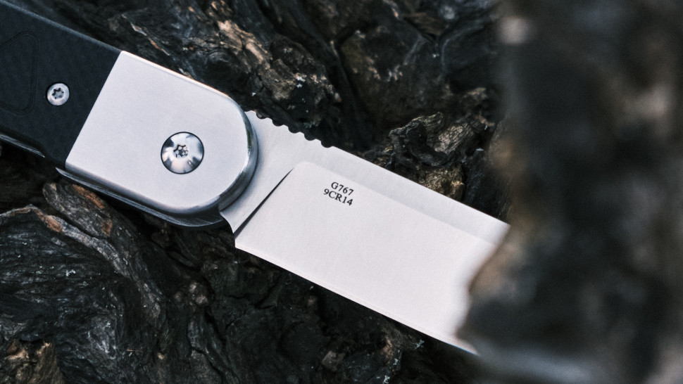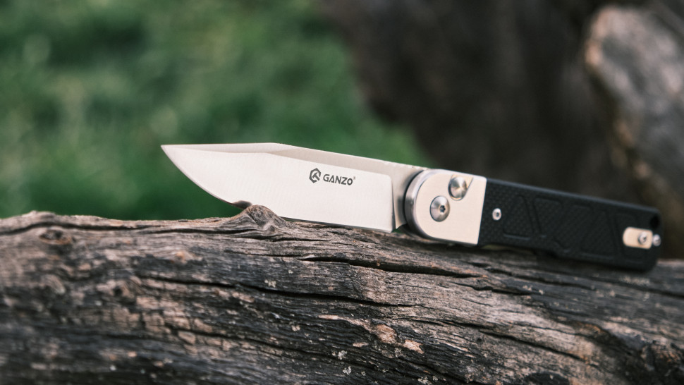 Материал клинка — сталь 9CR14, которая нечасто встречается в складных инструментах Ganzo. Это нержавеющая марка с высоким содержанием хрома и вспомогательными легирующими элементами в виде молибдена и ванадия, снижающими хрупкость и повышающими плотность металла. Твердость стали достигает эталонных 59 HRC, поэтому клинок эффективно справляется с резом материалов различной плотности.