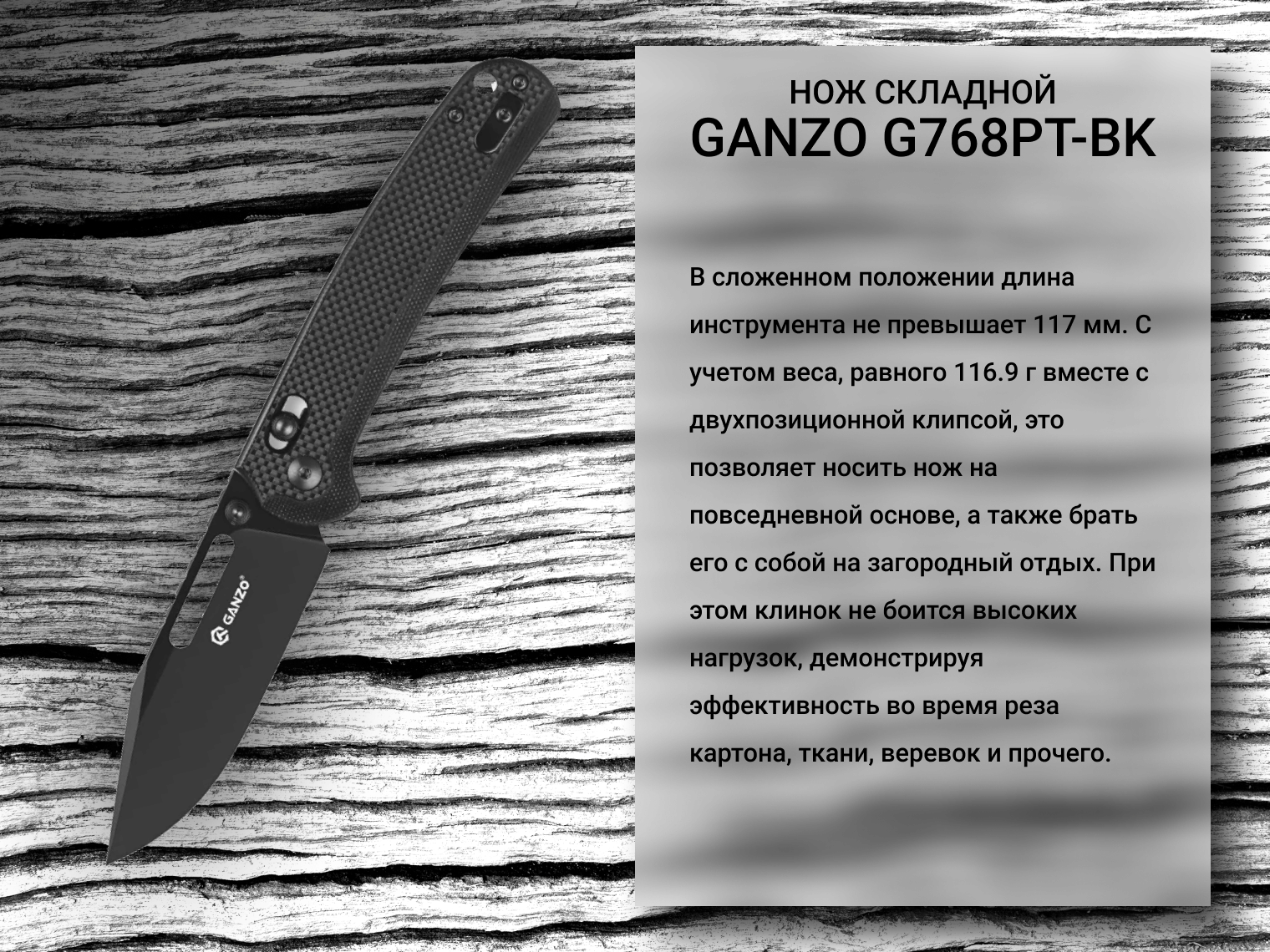 Модель Ganzo G768PT — это одна из вариаций складного ножа G768, которая сохранила качество реза и износостойкость своего предшественника, получив обновление в виде черного покрытия на клинке. Это решение не только привносит больше эстетики в общий дизайн конструкции, но выполняет и практические функции, упрочняя клинок и повышая его антикоррозионные свойства.