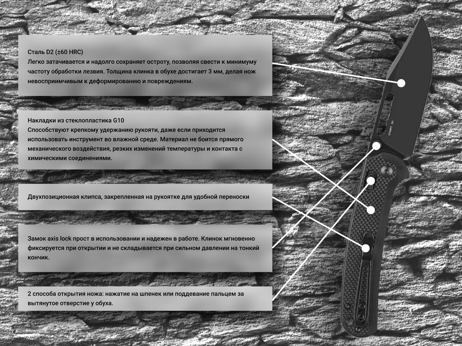 - Сталь D2 в клинке легко затачивается и надолго сохраняет остроту, позволяя свести к минимуму частоту обработки лезвия. Толщина клинка в обухе достигает 3 мм, делая нож невосприимчивым к деформированию и повреждениям.
