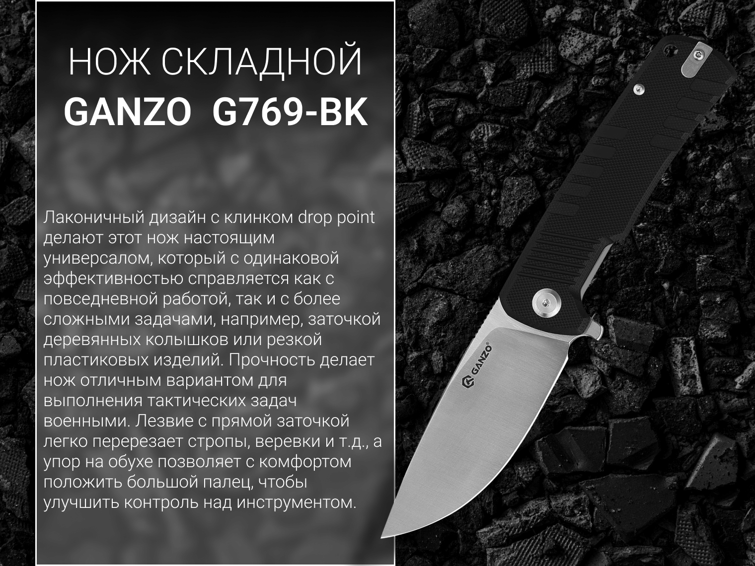 Лаконичный дизайн с клинком drop point делают из складного ножа Ganzo G769 настоящего универсала, который с одинаковой эффективностью справляется как с повседневной работой, так и с более сложными задачами, например, заточкой деревянных кольев или резом пластиковых изделий. При этом модель не занимает много места. Она складывается до 112 мм, что в совокупности с весом, не превышающим 135,8 г, облегчает транспортировку инструмента в любых условиях: во время ношения в пределах города или на природе, на рыбалке или в кемпинге.