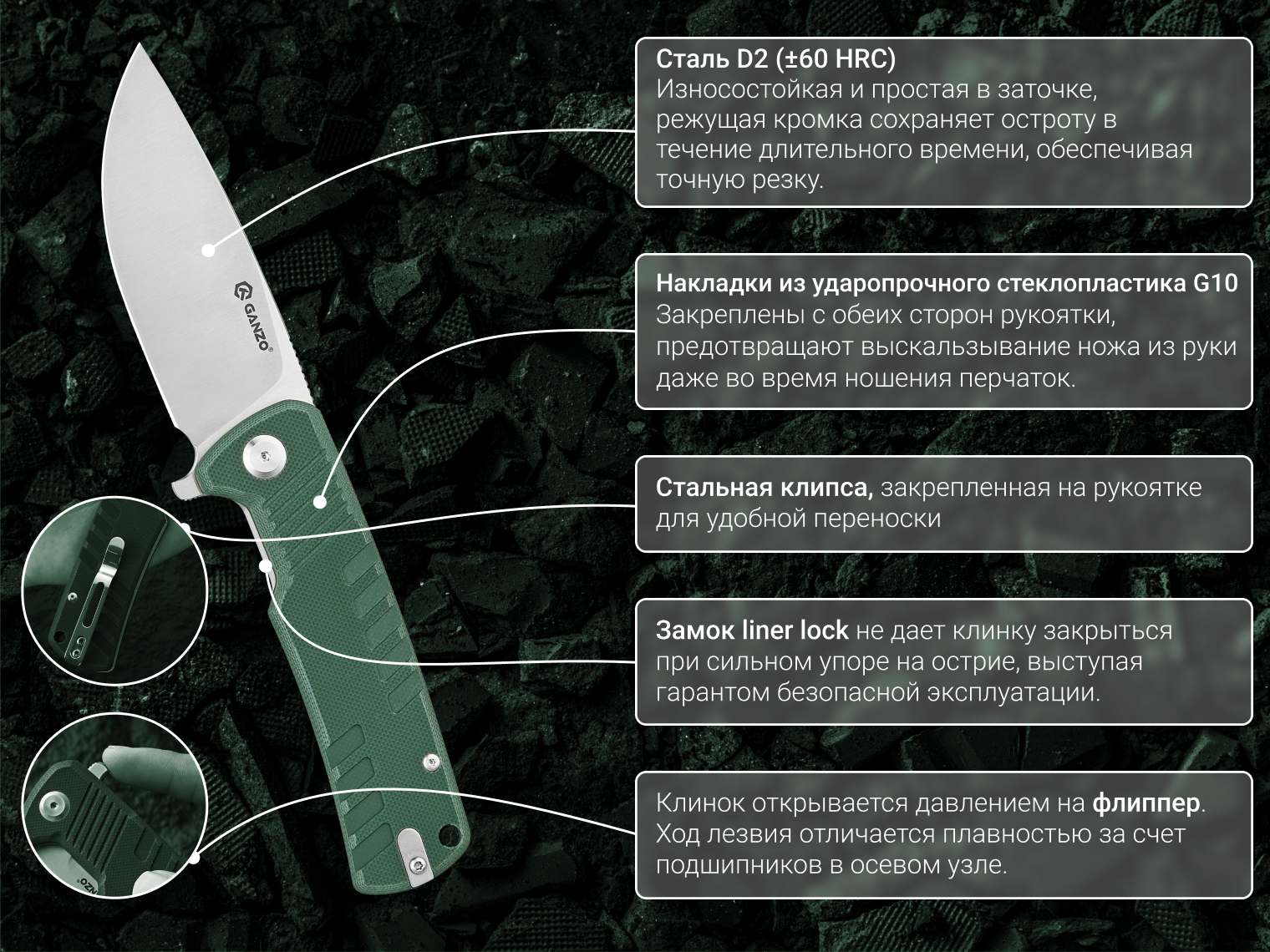 К главным преимуществам ножа Ganzo G769 относятся качественная механика и использование высококлассных материалов: