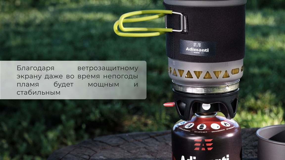 В комплекте не предусмотрено газового баллона. Пламя генерируется ровное и мощное, и не гаснет под порывами ветра. Материал комплекта: анодированный алюминий, лёгкий и прочный. Большой котёл оснащён специальной теплоизолирующей тканью, чтобы пользоваться было безопасно. Малый котелок имеет ручку из силикона – поэтому вы можете не опасаться ожогов. В горелке предусмотрели встроенный пьезоподжиг, чтобы работа была простой и удобной.