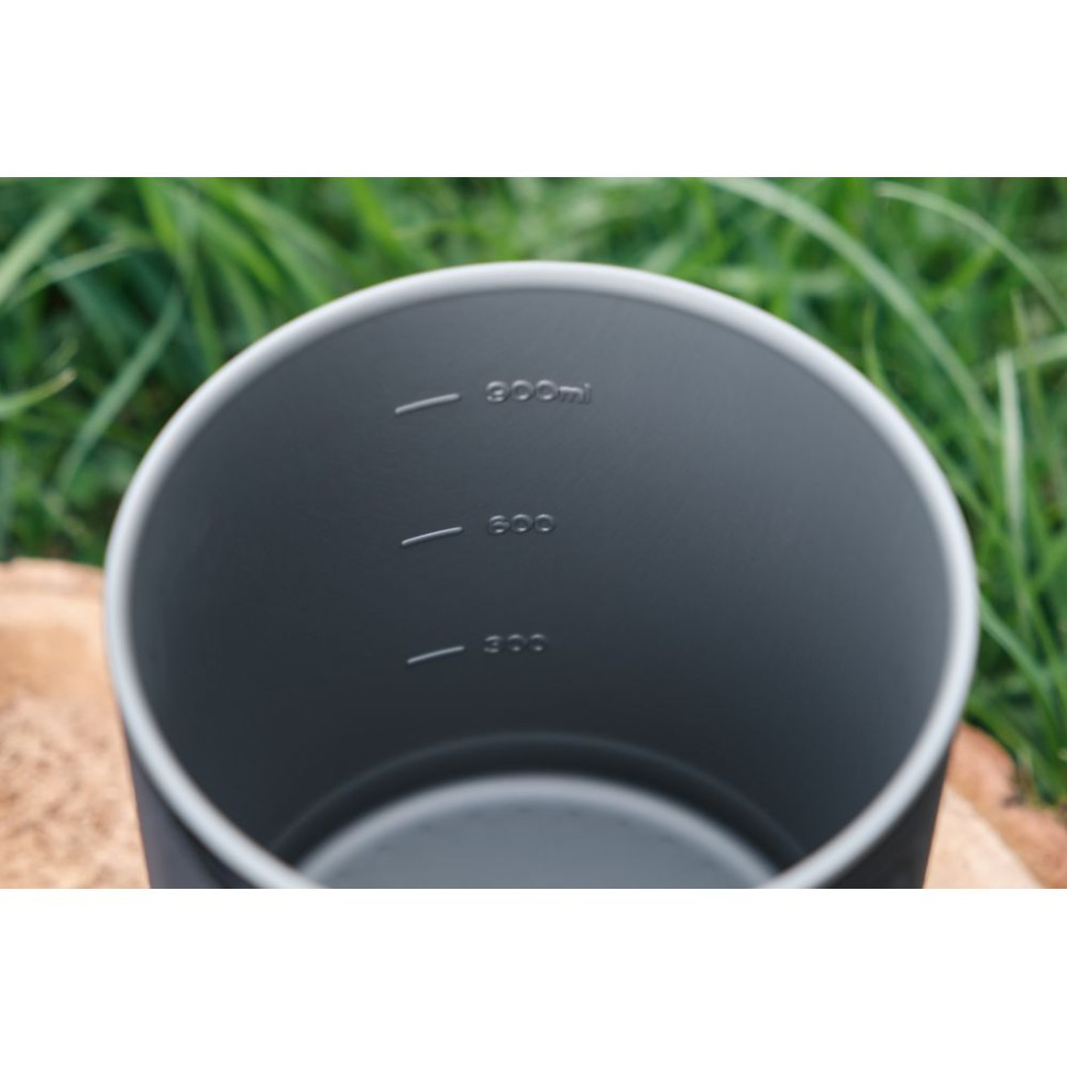 Чаша об'ємом 1100 мілілітрів виготовлена з твердого анодованого алюмінію, забезпечена м'якою кришкою з термопластичного еластомеру з отвором для кави.