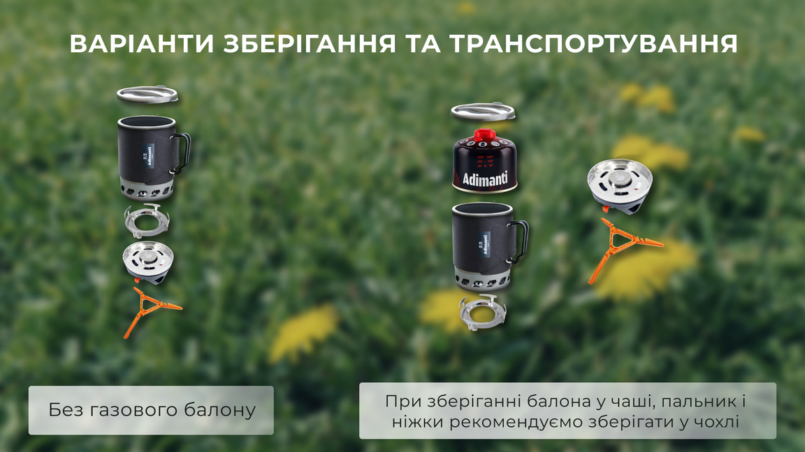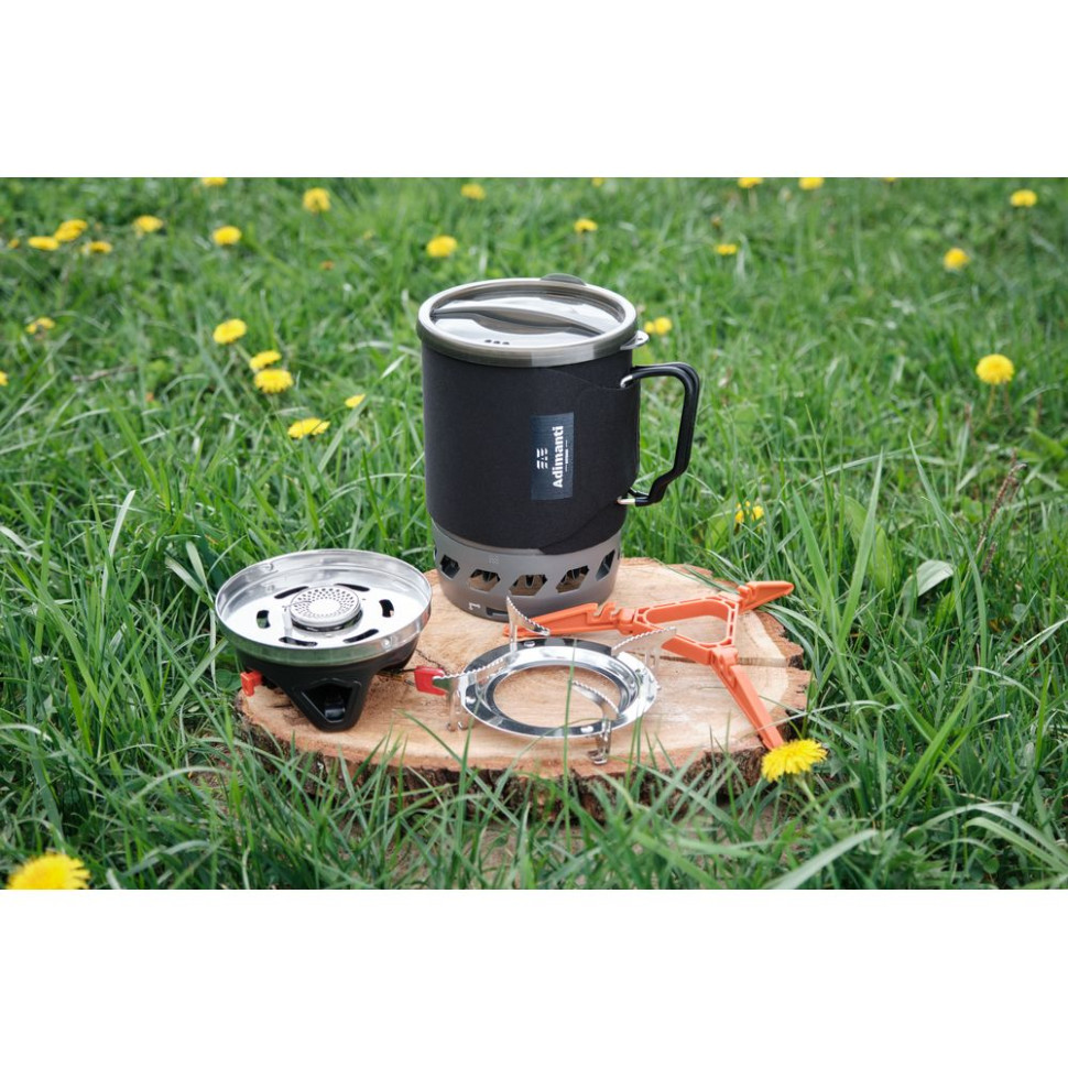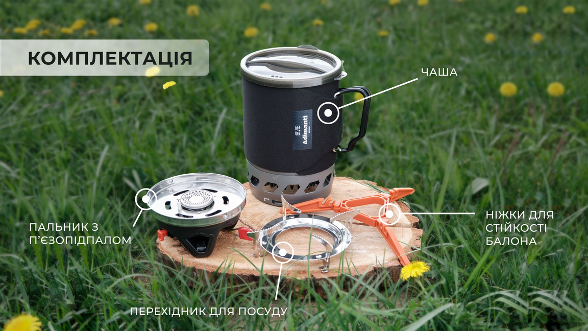 Опис системи приготування їжі Adimanti AD10 1100 мл Система приготування їжі допоможе під час перебування на природі: у різних видах туризму та активного відпочинку. Функціонує ця система на газі, але сам газовий балон у комплекті не представлений. Потужність пальника досягає 3685 Вт. Місткість котла становить 1100 мілілітрів. У наборі є: