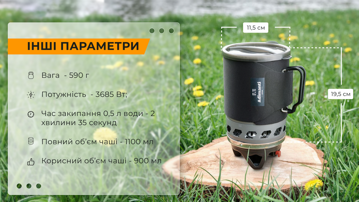система приготування їжі для туризму, активного відпочинку; потужність: 3685 Вт; ємність котла: 1100 мілілітрів; розміри каструлі: висота – 19,5 сантиметра, а ширина – 11,5 сантиметра; важить каструля 385 грам; вага комплекту в упакованому вигляді: 590 грам; гарантія: 12 місяців з моменту покупки.