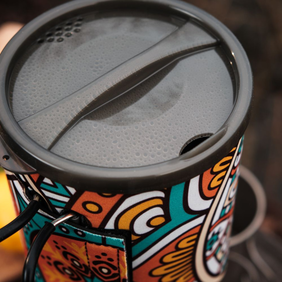 Чаша об'ємом 1400 мілілітрів виготовлена з твердого анодованого алюмінію, забезпечена м'якою кришкою з термопластичного еластомеру з отвором для кави.