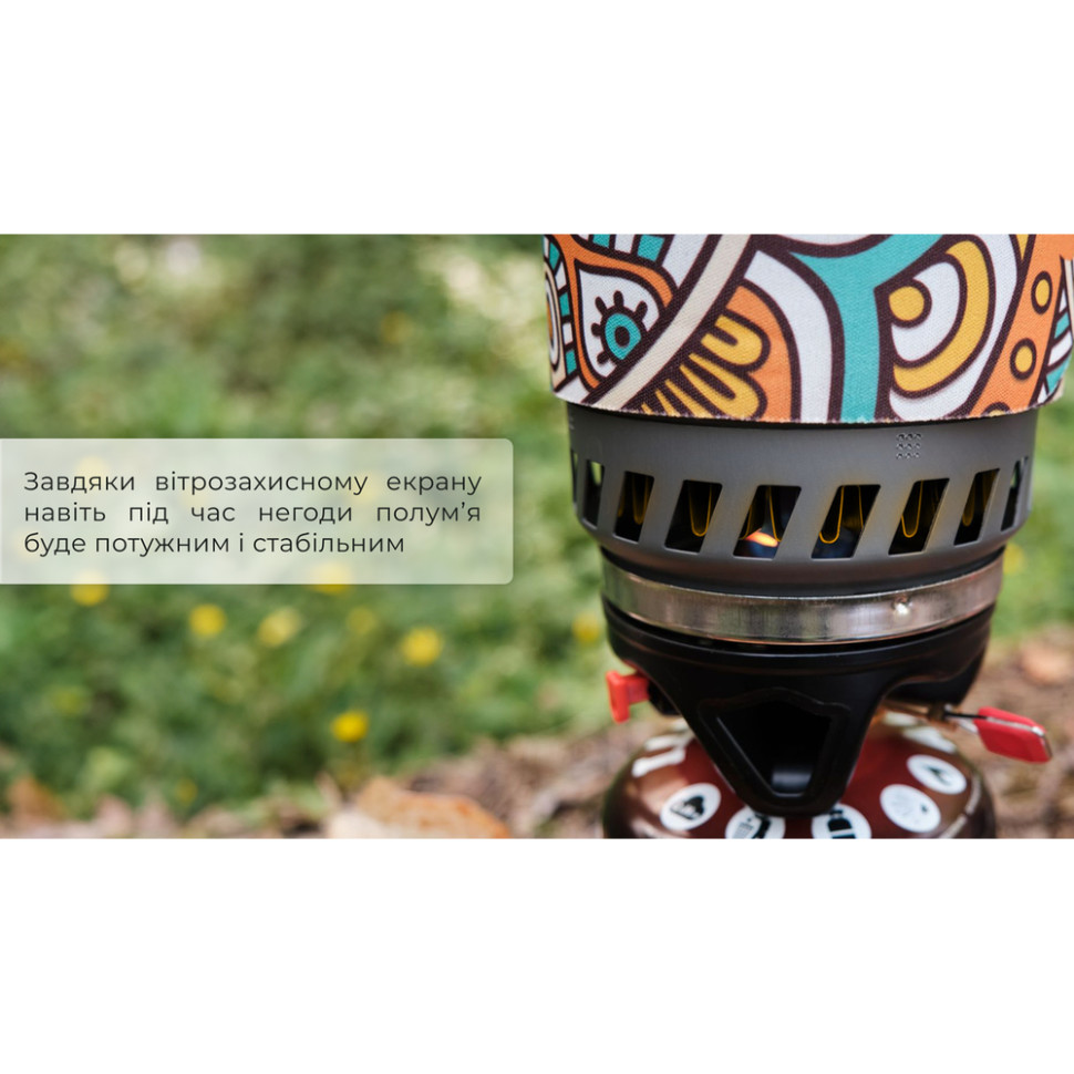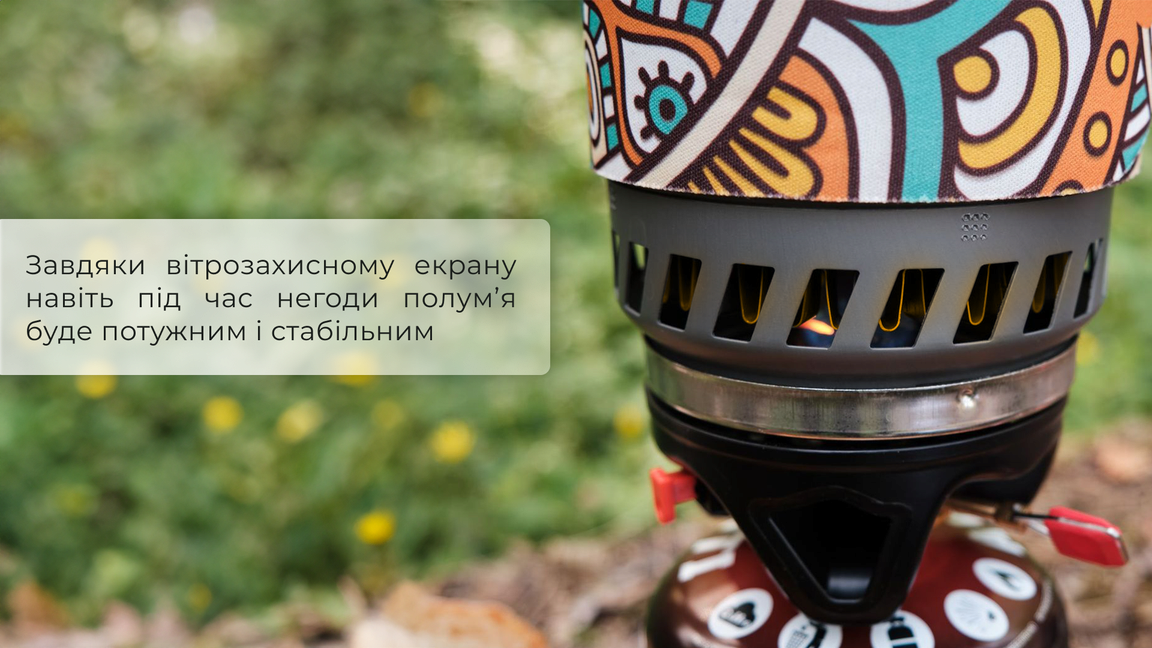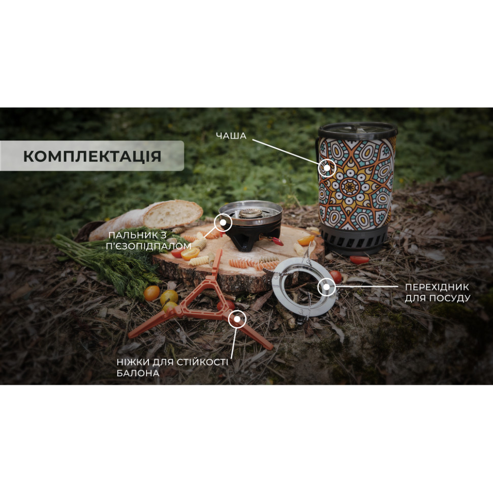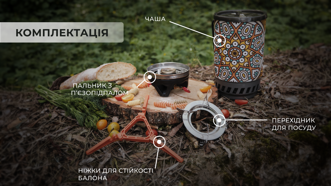 система приготування їжі для туризму, активного відпочинку; у наборі: каструля, газовий пальник, мішок для зберігання, коробка для пакування; метод запалювання: п'єзоелектричне запалювання; газ – пропан; набір для 1-2 осіб; розміри каструлі: 120*120*240 мм; вага каструлі: 427 грам; матеріал: алюміній; діаметр пальника: 96 міліметрів; ємність: 1400 мл; гарантія – 12 місяців з моменту придбання.