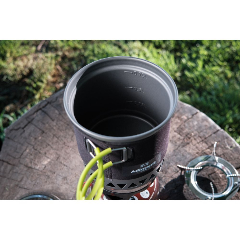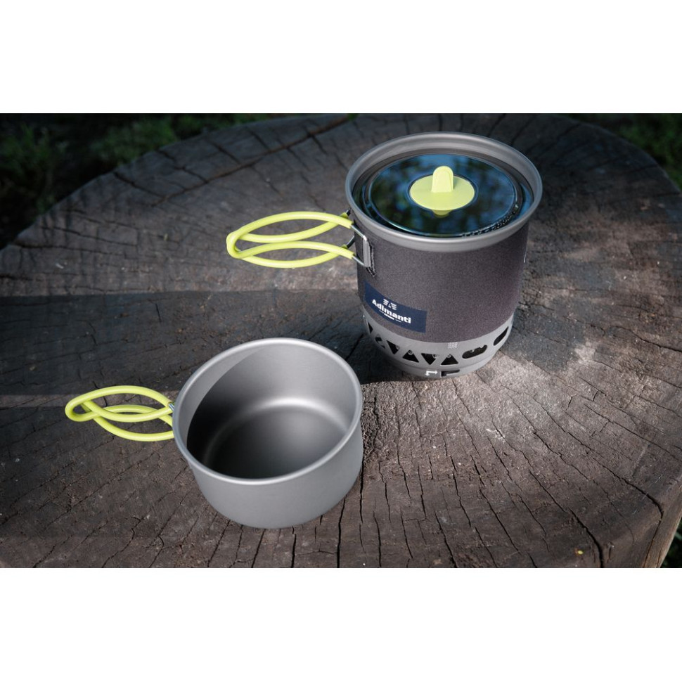 Ємність одного казанка – 750 мілілітрів, а другого – 400 мілілітрів. Більший котел має інтегрований теплопоглинаючий радіатор. Високе ККД роботи гарантує швидкий процес приготування їжі та, крім того, вдається заощадити паливо. Дрібний казан забезпечений комфортними ручками. Його ви можете використовувати як звичайний кухоль або миску.