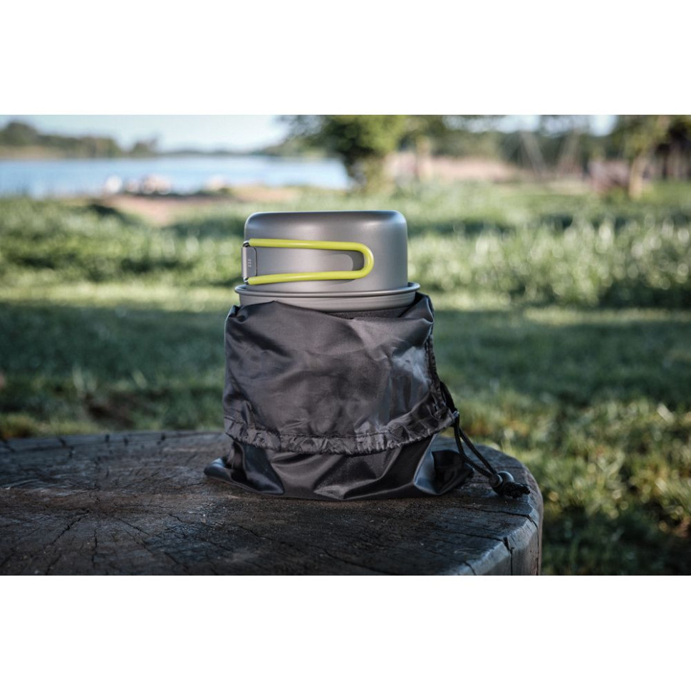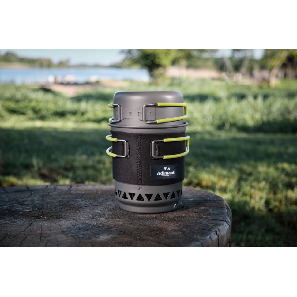 У комплекті не передбачено газового балона. Полум'я генерується рівне і потужне, і не гасне під поривами вітру. Матеріал комплекту: анодований алюміній, легкий та міцний. Великий котел оснащений спеціальною теплоізолюючою тканиною, щоб користуватися безпечно. Малий казанок має ручку із силікону – тому ви можете не побоюватися опіків. У пальнику передбачили вбудований п'єзопідпал, щоб робота була простою та зручною.
