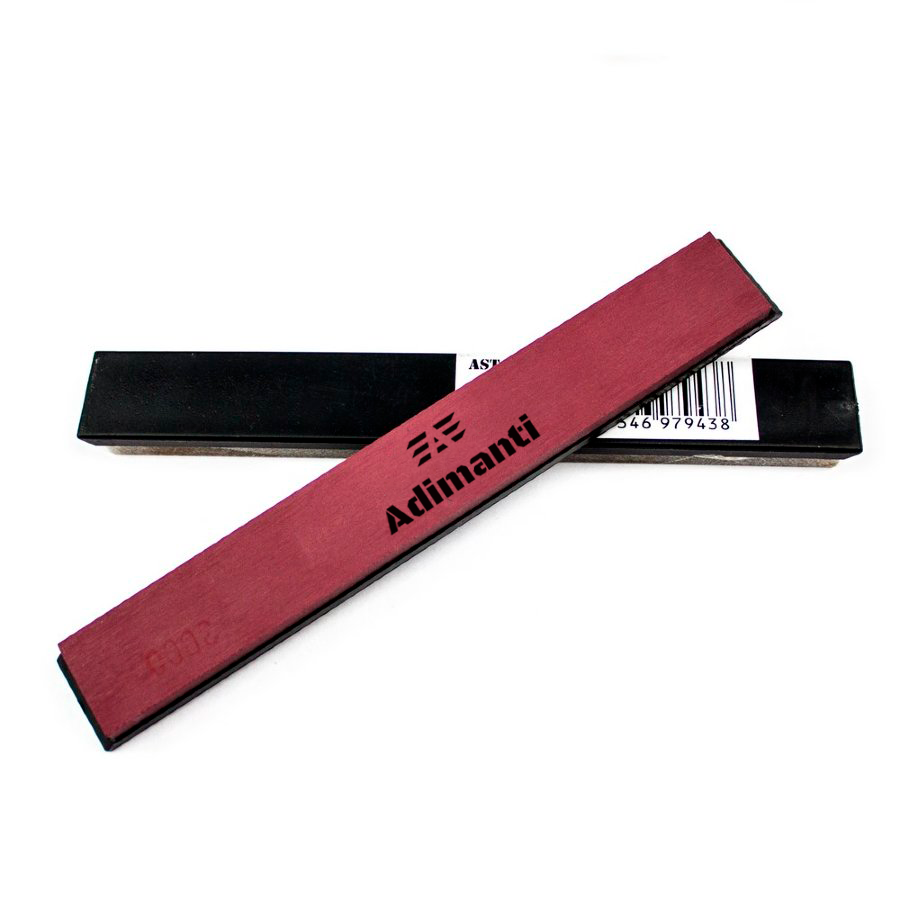 Алмазний камінь (рубін) Adimanti 3000, ADS3000: Щоб ріжуча кромка була максимально гладкою, а відповідно — гострою, на завершальному етапі заточування, слід використовувати шліфувальний точильний камінь. Adimanti 3000 з гритностью 3000 частинок на кожен квадратний сантиметр якраз відноситься до цієї категорії. Камінь розташований на підкладці з міцного пластику, розмір якої становить 15,7х2,2 см.його можна легко встановити на підставі найбільш популярних моделей точильних верстатів Ganzo або ж Apex. Але камінь цілком може використовуватися і в якості повноцінного інструменту в побутових або ж професійних потребах. Хоча поверхня Аdimanti 3000 досить гладка, щоб уникнути її засолювання, перед початком робіт камінь краще змочити водою, а після закінчення витерти або промити.