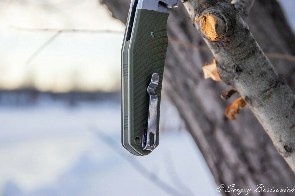 Кліпса кріпиться двома гвинтами, може бути встановлена і з боку осі клинка.