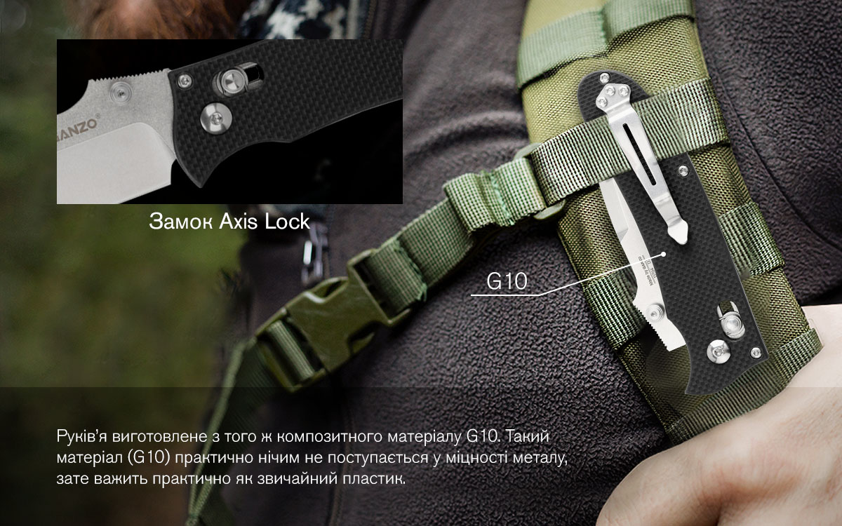 Лезо - сталь D2. Нарешті вона реалізувалася і в G704, адже саме її Ganzo віддає перевагу в своїх новинках. Цінителі давно чекали зміни марки сталі у даній моделі. На це є причини. Сталь D2 на сьогодні вважається однією з кращих для ножів. Тримає заточку, стійка до деформацій, високих температур і корозійних процесів.